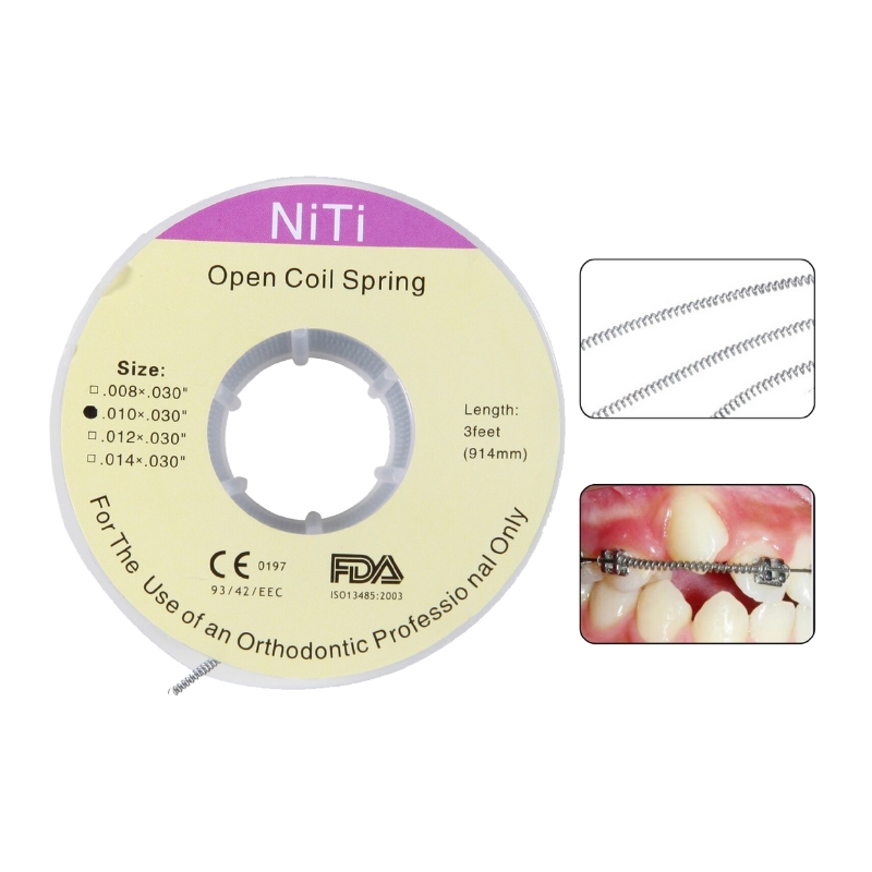 Cuộn lò xo mở NiTi Open Spring được chế tạo từ hợp kim Nickel-Titanium (NiTi), chuyên dùng để mở khoảng giữa các răng trong chỉnh nha. Thiết kế dạng cuộn cho phép cắt linh hoạt theo từng ca lâm sàng, giúp tối ưu chi phí và nâng cao hiệu quả điều trị.