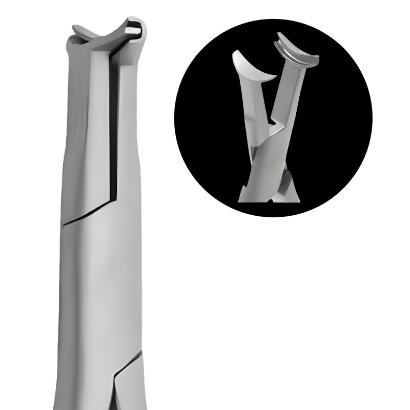 • Đầu kềm chắc chắn: có góc 90° so với cán, giúp dễ thao tác ở phía xa khó tiếp cận trong khoang miệng.